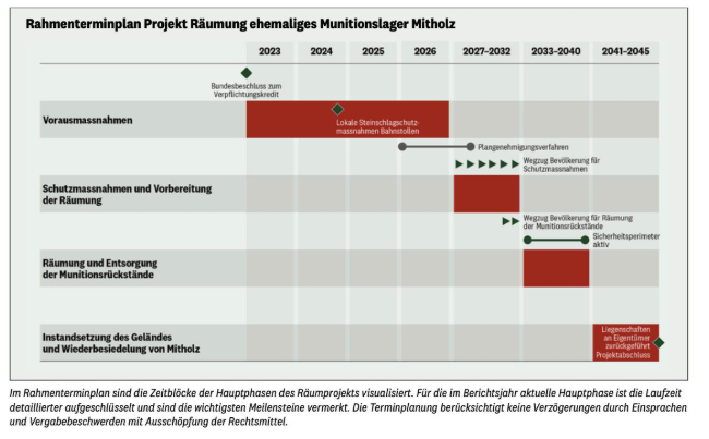 Das Gesamtkonzept sieht den Wegzug der Bevölkerung sowie vorbereitende bauliche Schutzmassnahmen an Strasse und Bahn vor. Die Vorbereitung und die eigentliche Räumung werden gemäss heutigem Kenntnisstand mindestens 20 Jahre dauern. Falls eine Räumung aus technischen oder Sicherheitsgründen nicht möglich ist oder abgebrochen werden muss, sieht das Konzept eine Überdeckung der Munitionsrückstände als Rückfalloption vor. In einer Mitwirkung stiess das Gesamtkonzept bei den betroffenen kantonalen und kommunalen Behörden und einem grossen Teil der Bevölkerung von Mitholz auf Zustimmung.